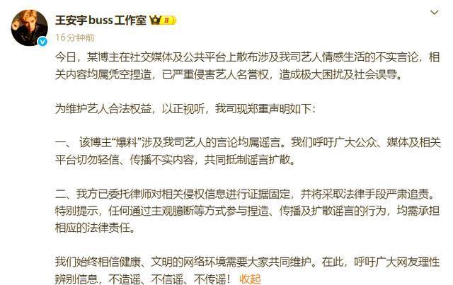 这场闹剧没持续半天就迎来反转。中午12点刚过,王安宇工作室率先发布声明,用“凭空捏造”“严重侵害名誉权”等字眼强硬回击,还晒出律师函截图,宣布已启动法律程序。不到半小时,关晓彤工作室也跟进表态:“此类信息纯属恶意捏造,已完成证据固定”,语气同样不容置喙。两家团队罕见的“闪电联动”,让这场绯闻还没发酵就按下了暂停键。 有趣的是,这波辟谣反而勾起网友对“前情提要”的讨论。有细心者发现,早在2025年,关晓彤就因“行程无交集”否认过与某顶流的绯闻,而王安宇去年底刚结束一部古装剧拍摄,两人的工作轨迹确实很难产生交集。更有人翻出关晓彤工作室的“辟谣史”,发现这已是团队近半年来第三次下场澄清,堪称“反谣言专业户”。 事实上,明星被造谣早已不是新鲜事。从“无中生有”的恋爱绯闻,到“移花接木”的P图黑料,网络时代的谣言总能精准踩中公众的八卦心理。但这次两家工作室的快速反应,或许能给行业提个醒:面对谣言与其“冷处理”让猜测蔓延,不如像这样用法律武器正面硬刚。毕竟对艺人来说,沉默有时反而成了谣言滋生的温床。 目前,爆料者已删除相关内容,但#王安宇关晓彤没见过面#的话题仍在发酵。有粉丝调侃:“连面都没见过就被谈恋爱,这届网友比月老还忙。”也有路人感慨:“与其操心明星私事,不如多关注他们的作品。”截至发稿,王安宇正在剧组拍摄新剧,关晓彤则忙于时尚活动,两人的工作节奏丝毫未受影响。 这场风波就像一面镜子,照出了娱乐圈的荒诞与清醒。当谣言跑得比真相快时,工作室的及时辟谣是对艺人的保护,也是对网络生态的净化。而作为观众,或许我们更该学会理性吃瓜——毕竟,没有实锤的“瓜”,吃多了容易消化不良。